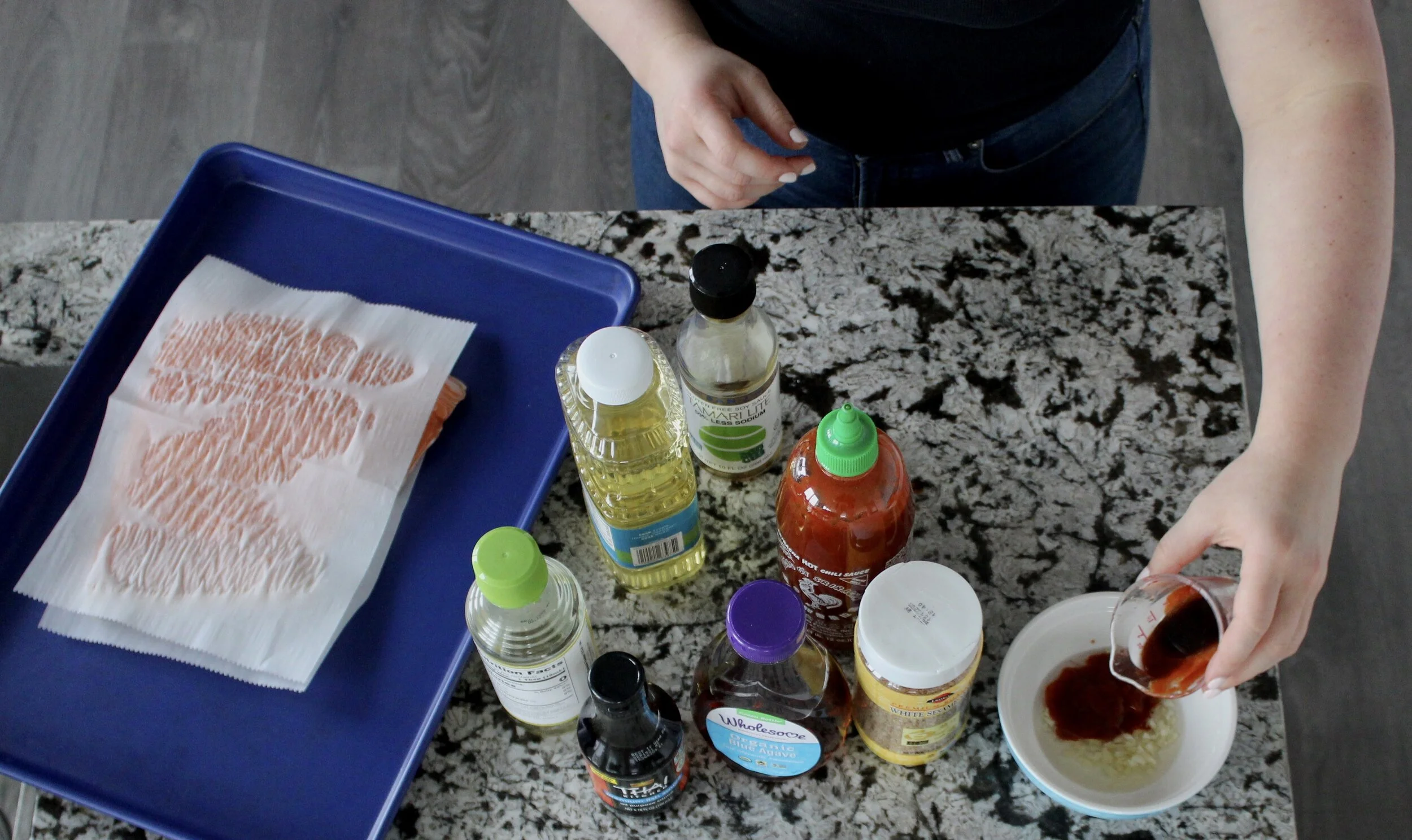 — night one: honey sriracha salmon, sushi rice, crunchy asian salad with that sushi restaurant dressing